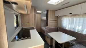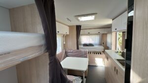 En su interior destaca un ambiente amplio y muy luminoso gracias a su diseño abierto y moderno. Dispone de una distribución familiar con literas, cama principal y un salón convertible, lo que permite alojar cómodamente a varias personas. La calidad de los acabados es superior, con mobiliario en tonos claros que aportan sensación de espacio y calidez. La cocina está bien integrada en el conjunto, con buena superficie de trabajo y almacenamiento suficiente para el día a día. El baño ofrece una distribución práctica con ducha y WC, asegurando comodidad y privacidad. Además, cuenta con iluminación ambiental LED que mejora el confort y crea un ambiente acogedor.