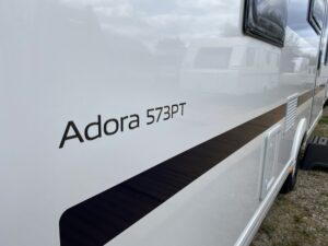 Por fuera, la Adora 573 PT destaca por su diseño contemporáneo con líneas limpias y una estética muy cuidada. Su carrocería está bien aislada, pensada para mantener una temperatura interior agradable durante todo el año. Incorpora grandes ventanas panorámicas que aportan luz natural al interior, además de una claraboya que mejora la ventilación. La estructura es sólida y resistente, con materiales de calidad que garantizan durabilidad. También incluye detalles prácticos como puerta de entrada con mosquitera y soluciones pensadas para facilitar la vida en camping o ruta.