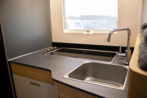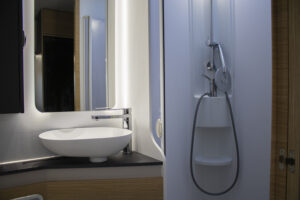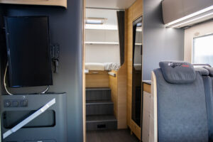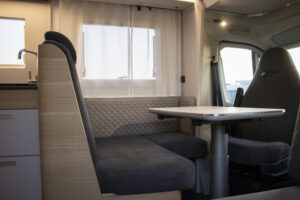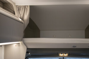 En su interior destaca la gran capacidad de descanso: cuenta con camas gemelas en la parte trasera, una amplia cama en la capuchina sobre la cabina y un salón convertible, lo que permite alojar a varias personas sin problema. El salón es espacioso, con buena zona de comedor y asientos cómodos. La cocina está bien equipada, con espacio suficiente para cocinar con comodidad y almacenar alimentos. El baño ofrece una distribución funcional con ducha y WC, pensado para un uso intensivo en viajes familiares. Además, dispone de múltiples espacios de almacenaje y una iluminación que crea un ambiente práctico y acogedor.