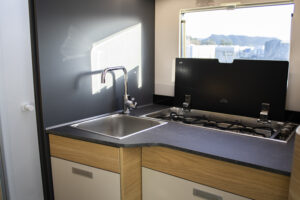 En su interior, la 670 SL ofrece una distribución muy inteligente: dispone de camas traseras individuales convertibles (gemelas) que pueden juntarse para formar una cama XL, y una cama abatible eléctrica sobre el salón para maximizar las plazas para dormir (según concesionario hasta 6). El salón en “L” es amplio, con buena ergonomía y mesa ajustable, lo que invita a socializar o relajarse. La cocina está bien equipada, con tres fuegos, fregadero inox y nevera de 142 L según datos de concesionarios. El baño ofrece ducha independiente y WC extraíble, lo que aporta privacidad y funcionalidad. Para el almacenamiento hay multitud de compartimentos diseñados de forma inteligente y una iluminación LED regulable que ayuda a crear un ambiente acogedor.