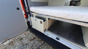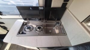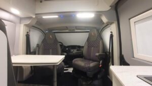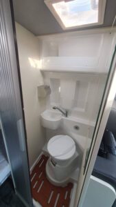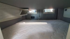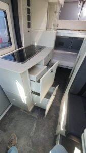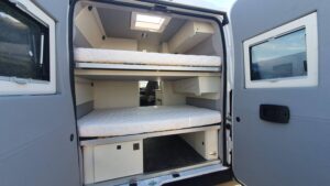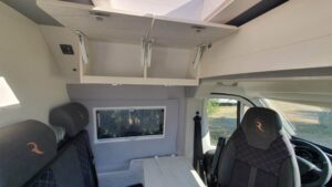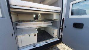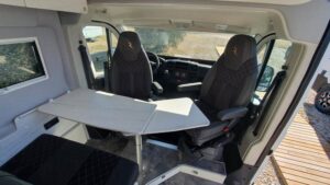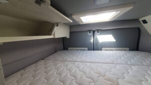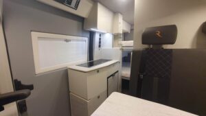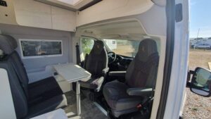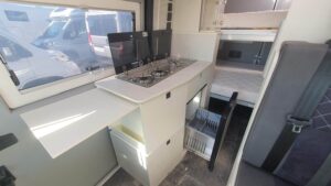 En su interior ofrece una distribución claramente enfocada a familias, con varias plazas para dormir gracias a la cama trasera, la posibilidad de cama en techo elevable (según versión) y zona convertible. El salón es amplio y cómodo, con asientos giratorios que crean un espacio acogedor para el día a día. La cocina está bien equipada, con buena superficie de trabajo y almacenamiento suficiente para viajes largos. El baño es completo, con ducha y WC, algo destacable en este tipo de camper. Los acabados son de alta calidad, con materiales premium y una iluminación cuidada que aporta sensación de confort y amplitud, además de múltiples soluciones de almacenaje bien integradas.